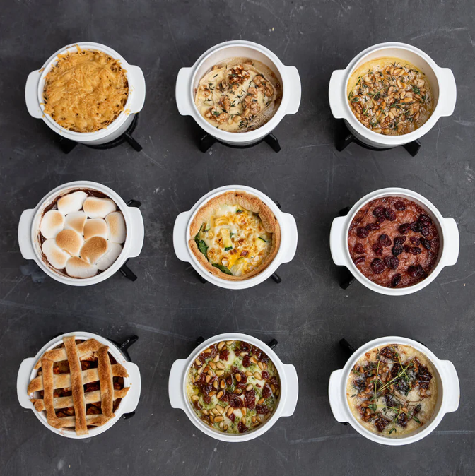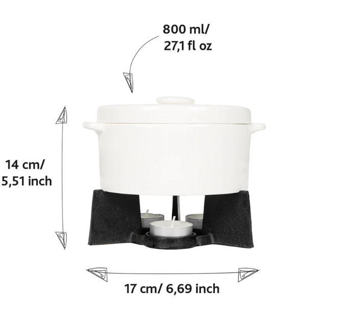 The multifunctional ceramic baking dish has a capacity of 800 ml and a diameter of 15 cm. On the cast iron stand, the 3 tea lights and the lid keep the dish warm for you.